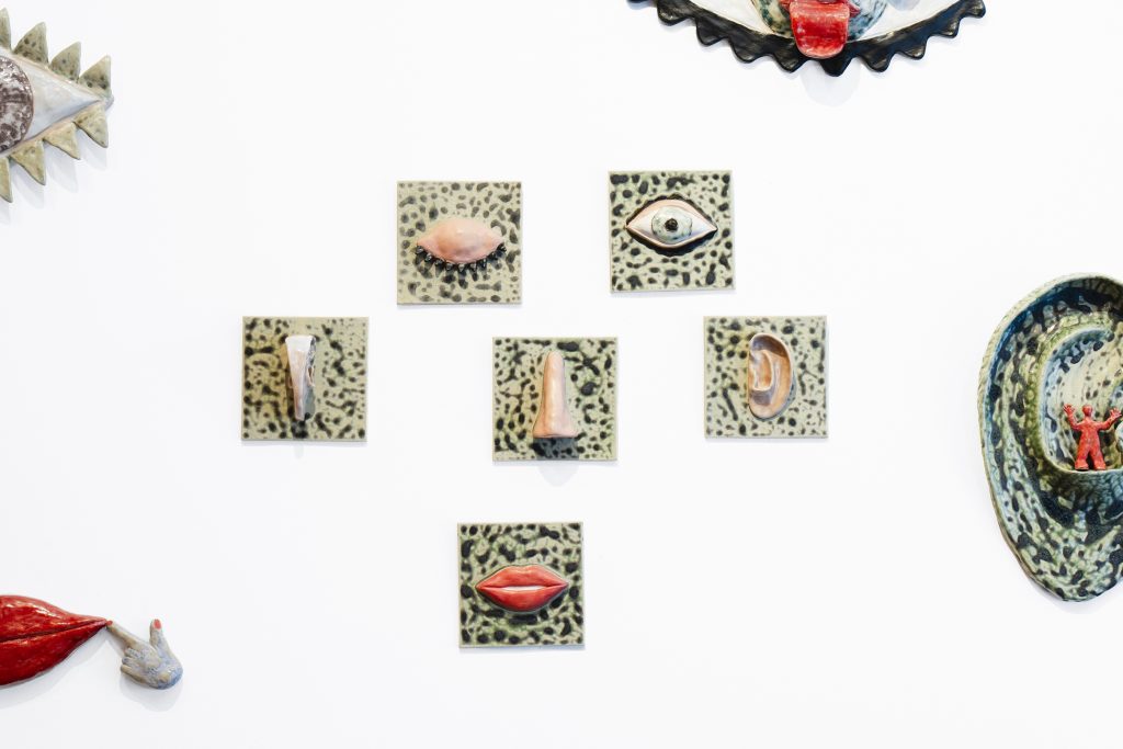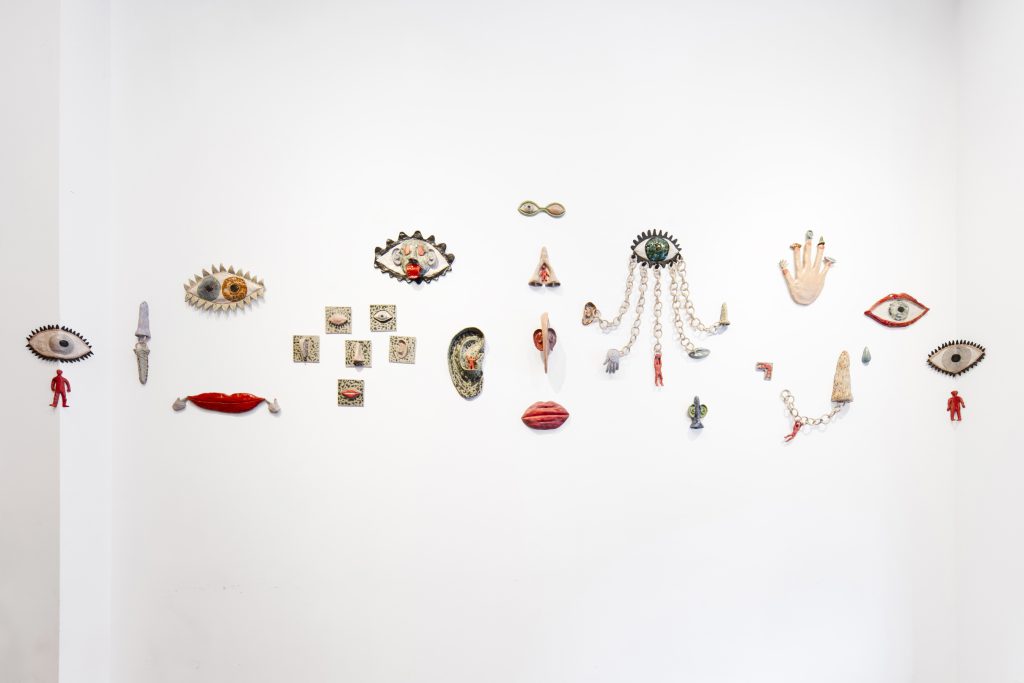 Rácz Rebeka’s exhibition is a parade of body parts: as if, slipping into the mind of a curious onlooker, we attempted to name the multitude of eyes, noses, ears, mouths, and hands perceived in the surrounding environment. In the head of an observer momentarily dislodged from the rhythm of reality, what is seen lives on as a grotesque fantasy.