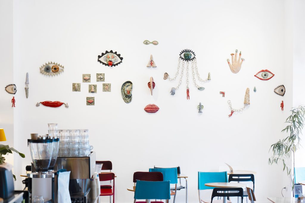We live in an intensely body-centred world where, due to the constant presence of virtuality, the physical nature of sensing our own bodies often dissolves. Sitting in a café, Rácz’s objects urge us to look up from behind our laptops, to observe, to listen, to return to our physical presence, and to play with the visuality of our surroundings — just as she herself does while shaping her works.