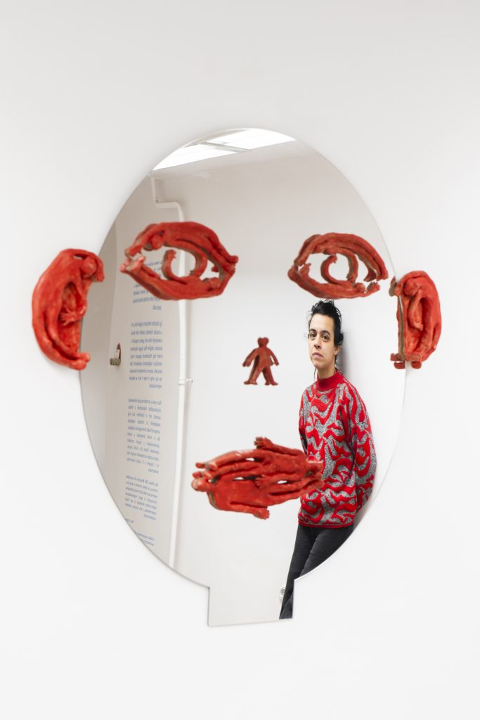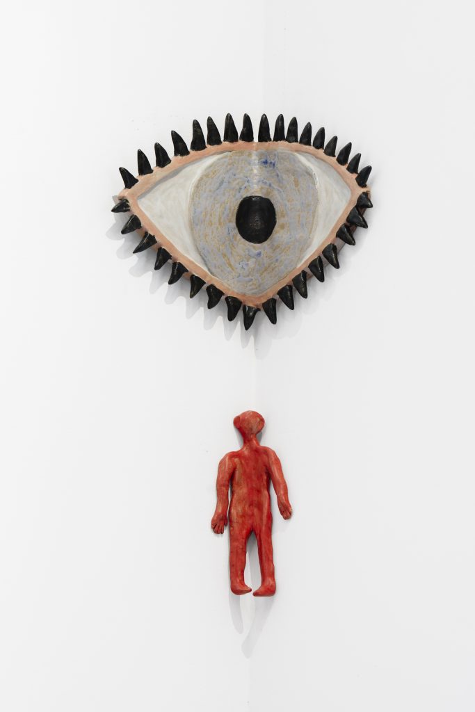 Rácz’s practice loosely connects to the tradition of Surrealism: fantasy gains authority in the representation of the world around us, and the dreamer’s subconscious appears in anthropomorphic form throughout the exhibition. Although the works refrain from conveying explicit messages, the central piece, Chained Eye, draws attention to the underrepresented roles of hearing, touch, taste, and smell within the vision-centred society of the 21st century.